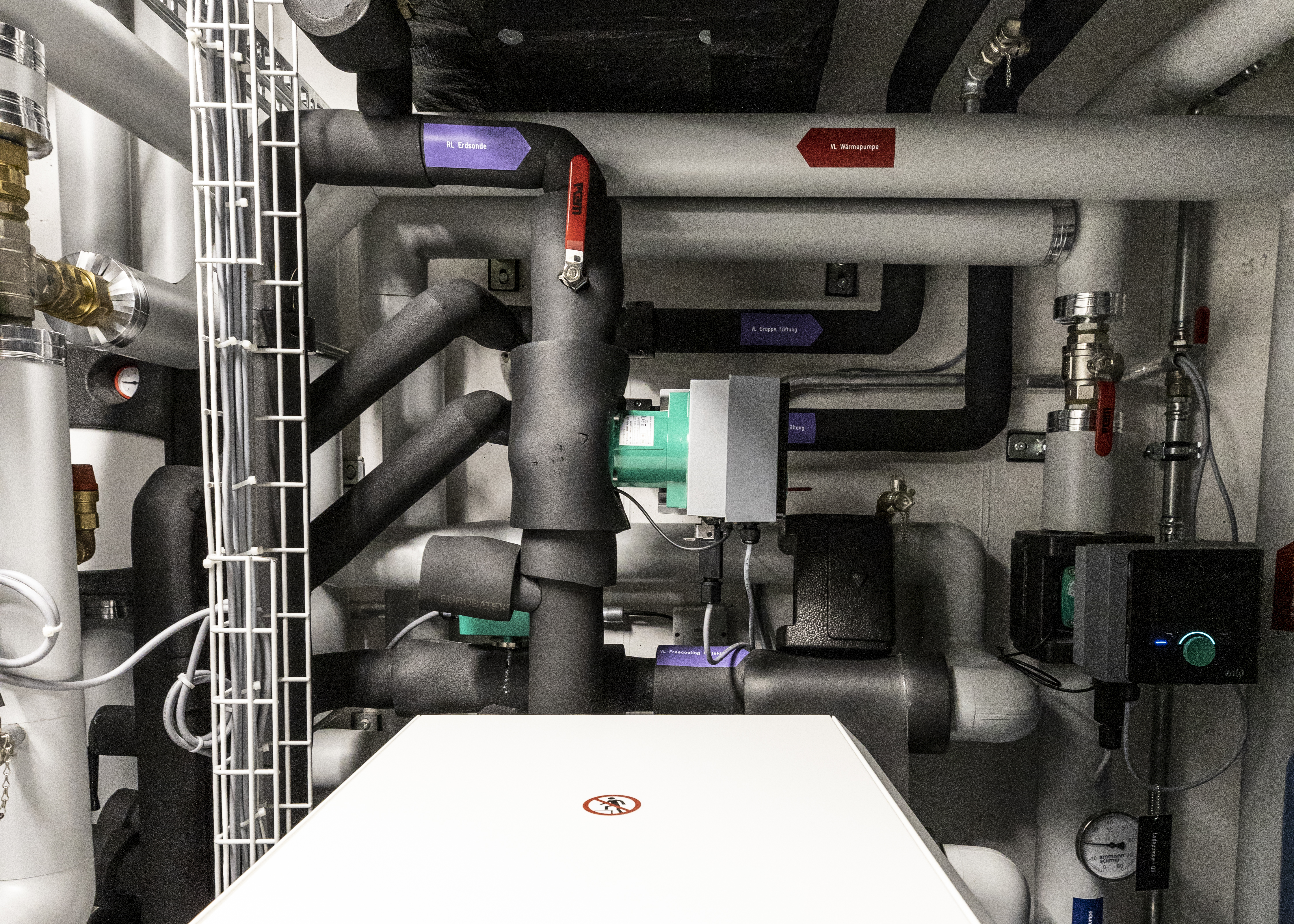 Die Lehmwand ist wichtig für das Raumklima. In der fünf Zentimeter dicken Lehmschicht an der Wand befinden sich Leitungsrohre, durch die im Winter warmes und im Sommer kaltes Wasser fliesst. Das System funktioniert damit als Heizung und Kühlung zugleich. Zwei Erdsonden holen die Wärme und Kühle aus dem Boden und übertragen sie auf das Wasser.