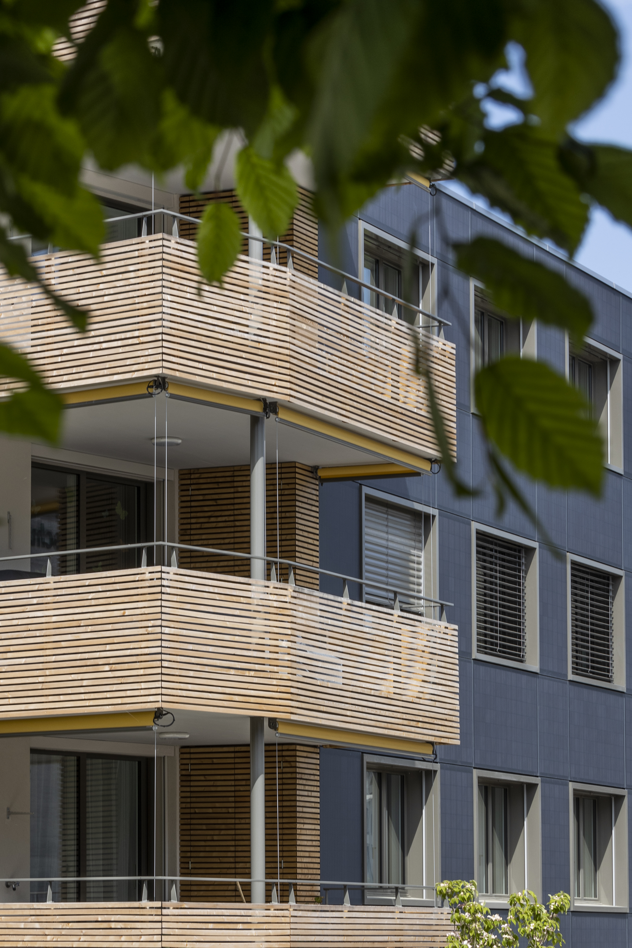 Das Wohngebäude bildet einen kompakten Baukörper und ist süd- und südostseitig mit Photovoltaikelementen verkleidet. Ein halbtransparentes Photovoltaikelement ermöglicht ein spannendes Lichtspiel im Treppenhaus und dient gleichzeitig als Beschattung. Die grosszügigen gedeckten Balkonnischen sind mit einem Holzgeländer abgeschlossen. Die Kombination von Holz und Solar macht das architektonische Konzept perfekt. Die Wohnräume und zwei Zimmer sind nach Süden orientiert, sind durch die grossen Fenster hell belichtet und können so die passive Sonnenenergie optimal nutzen.